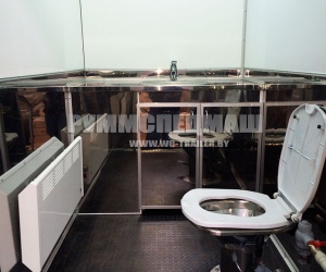 Нержавеющая сталь – один из наиболее прочных и надежных материалов, способный обеспечить максимальную безопасность пассажирам. Отделка кабинок нержавеющей сталью, это не только отличное функциональное, но и прекрасное дизайнерское решение. Металлическая кабинка – это красиво, стильно и современно. Металл прекрасно сочетается с зеркалами и другими элементами декора кабинки. Сталь может быть матовой, не требующей особого ухода, т.к. на ней не остаются отпечатки рук и разводы или зеркальной. Отполированная до зеркального блеска облицовка зрительно увеличивает внутренне пространство кабинки. Холодный металлический блеск и чистые линии отсылают к современному стилю хай-тек, что позволяет без дополнительных затрат и усилий сделать в передвижном туалете кабинки с стильными элементами интерьера. Нержавейка имеет прекрасные антивандальные свойства. Помимо внешней эстетики, туалетные кабинки облицованные нержавеющей сталью обладают стойкостью к механическим повреждениям, высокой прочностью и долговечностью, что не менее важно, чем то же оборудование в самой кабине. Компания Руммспецмаш очень требовательно относится к качеству своих изделий, именно поэтому изготавливает все детали только на собственном производстве и только из самых лучших материалов.